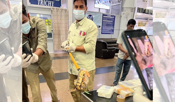 (Pegawai kastam merampas 47 jenis ular sawa di Lapangan Terbang Trichy/FOTO Twitter @isureshofficial)
