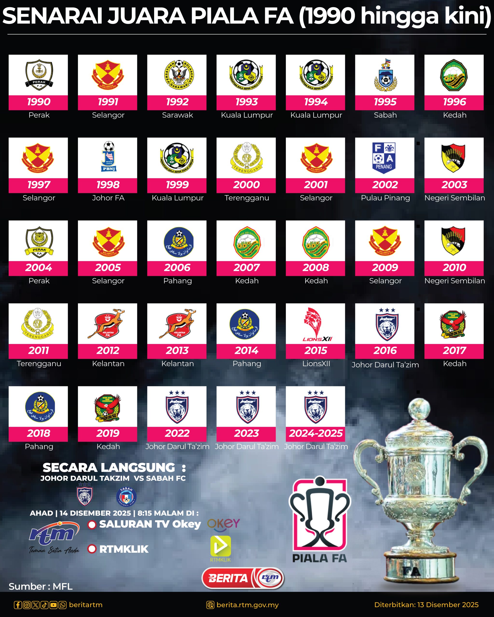 Utama Infografik SENARAI JUARA PIALA FA (1990 HINGGA KINI) SENARAI JUARA PIALA FA (1990 HINGGA KINI)13/12/2025 | 4:13 pmInfografik Kongsi berita Share on X (Twitter) Share on Facebook Share on WhatsApp Share on Telegram Berita sebelumnyaPengundian PRN Sabah terkawal, tiada insiden tidak diinginiBerita seterusnyaKES SULU: KRONOLOGI KEMENANGAN MALAYSIA (2) PALING POPULAR [TEST] FIFA pertahankan harga tiket Piala Dunia, tumpu hasil untuk bola sepak global Dunia [TEST] Datuk Dr Sahruddin letak jawatan Pengerusi PN Johor Nasional