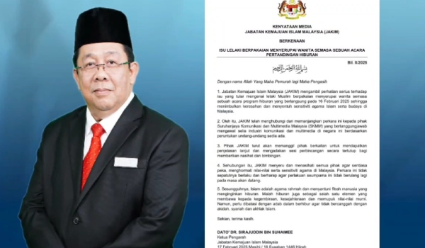 Ketua Pengarah JAKIM Datuk Dr Sirajuddin Suhaimee dalam satu kenyataan memaklumkan perkara itu susulan tular mengenai lelaki Muslim berpakaian menyerupai wanita dalam sebuah program hiburan di ibu negara baru-baru ini.