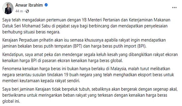 KUALA LUMPUR, 2 Oktober- Kerajaan Perpaduan prihatin terhadap isu semasa khususnya berkenaan bekalan beras putih tempatan (BPT) dan harga beras putih import (BPI) kata Perdana Menteri Datuk Seri Anwar Ibrahim menerusi satu hantaran di facebook hari ini.