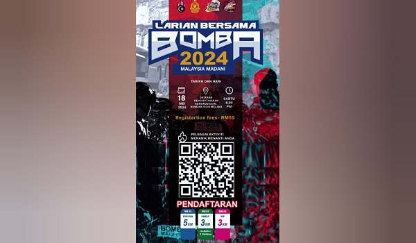 KUALA LUMPUR, 23 April- Jabatan Bomba dan Penyelamat Malaysia (JBPM) menganjurkan Larian Bersama Bomba bagi tahun 2024 di negeri Melaka pada Sabtu, 18 Mei depan.