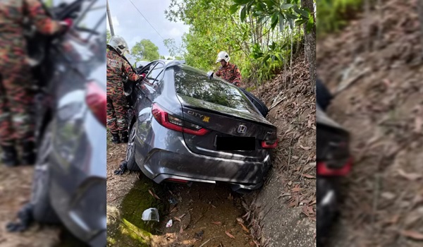 Tiga parah kereta dinaiki terbabas, masuk longkang